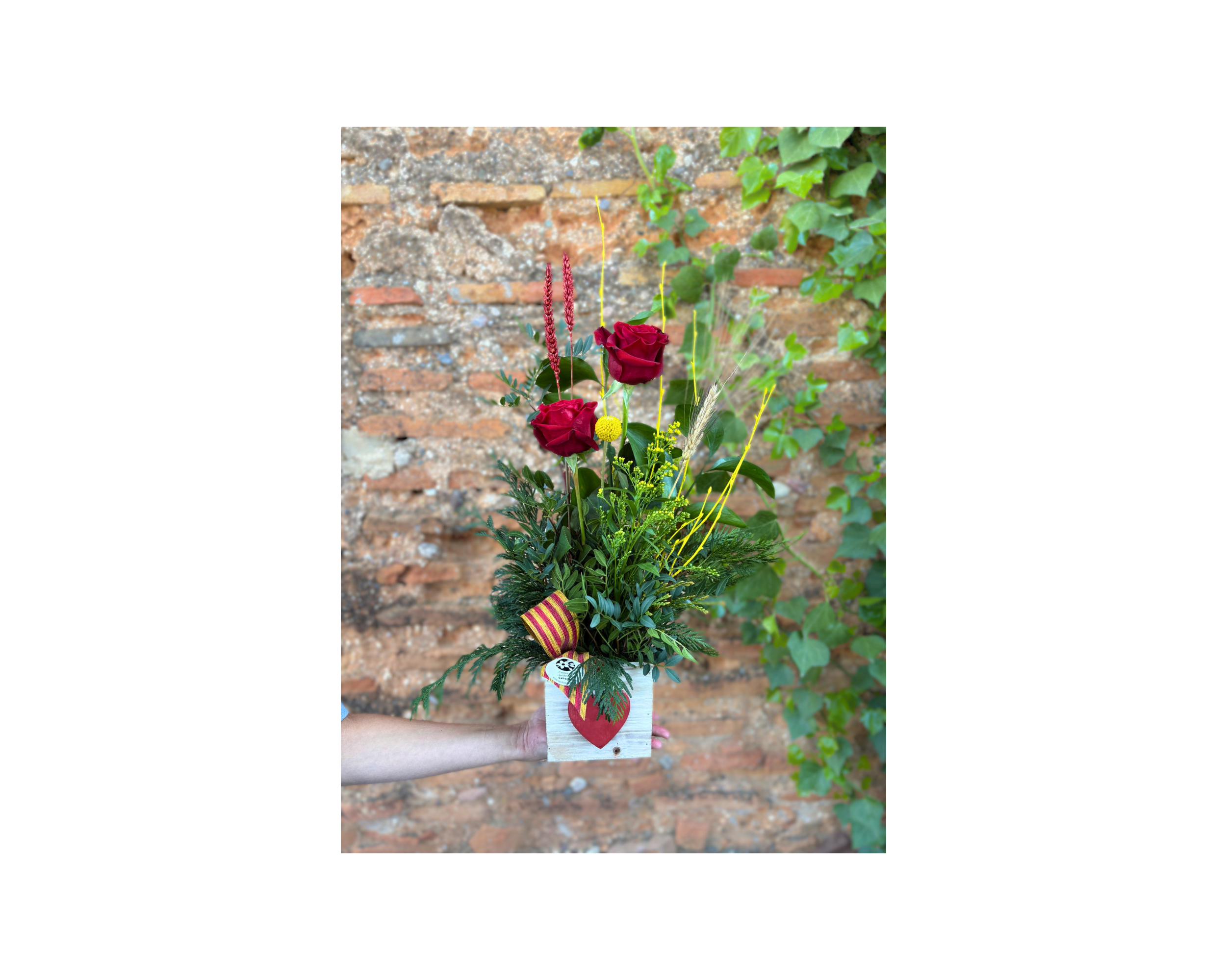 Bouquet en caixa de fusta i penjoll de cor, conté dues roses vermelles, verd i decoració de Sant Jordi. La caixa de fusta es pot triar de color blanc trencat amb el cor vermell (com a la imatge) o a la inversa, deixant un comenatri al fer la comanda.