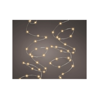 Garlanda artificial amb llums càlides incorporades, medeix 270cm de llarg. Funciona amb 3 piles AA (no incloses), té 8 funcions de llums diferents i temporitzador.