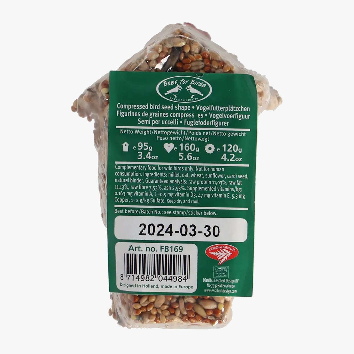 Mima els ocells amb un deliciós regal! L’alimentació està feta de llavors premsades en formes decoratives, que es poden penjar a qualsevol lloc del jardí gràcies a la corda. Només conté ingredients naturals i, per tant, serveix com a complement a l’aliment disponible de manera natural.