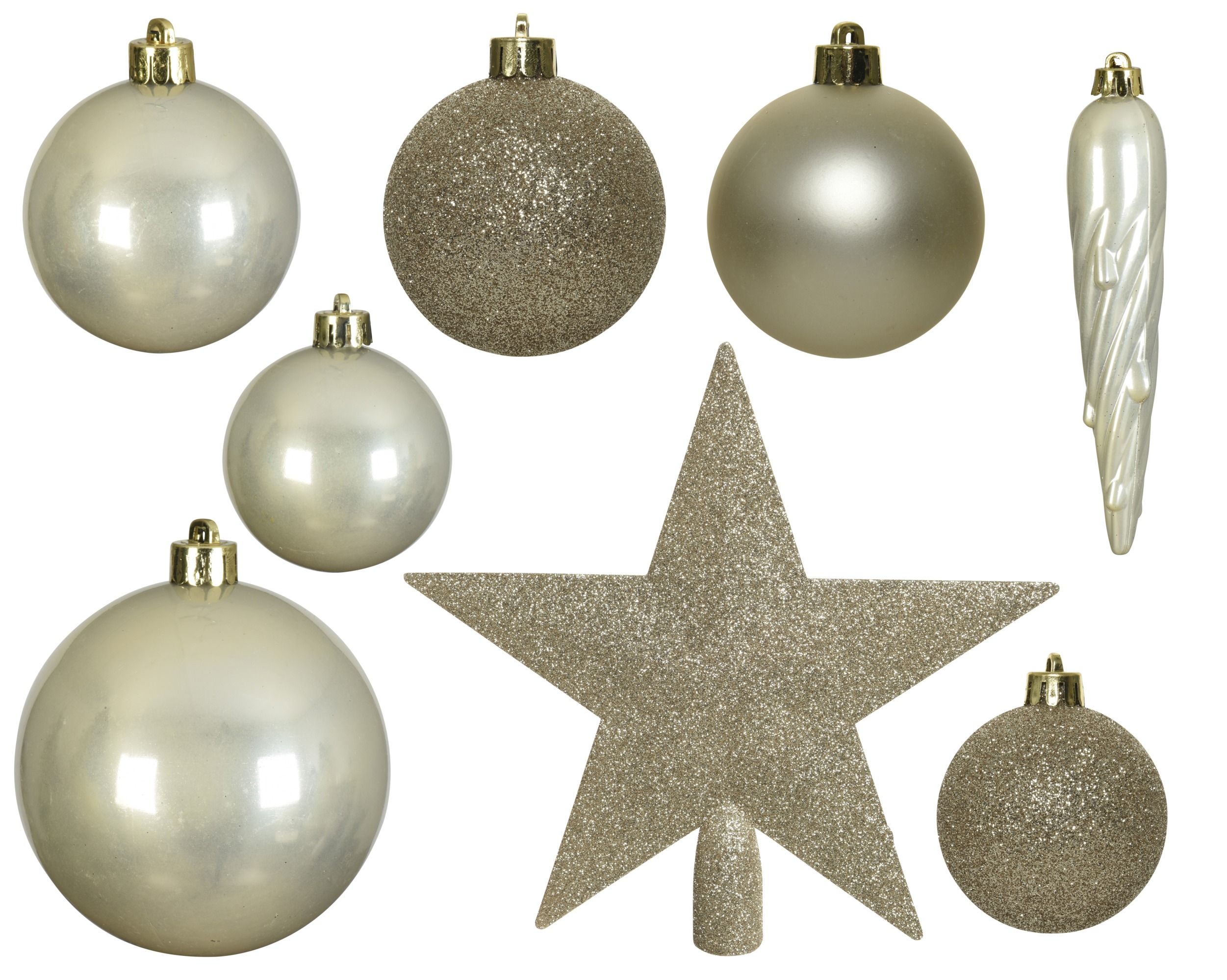 Pack que conté 33 elements decoratius de color or, entre elles hi ha boles de diferents textures (mat i brillant), estalactites i una estrella.