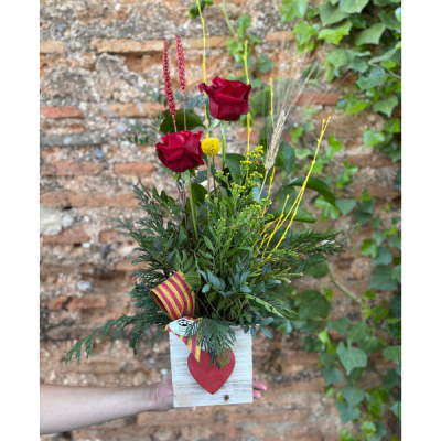 Rosa preservada de Sant Jordi que inclou una base de fusta i una proveta de vidre amb una rosa vermella i espiga catalana. Aquesta rosa és natural i porta un tractament que fa que quedi intacta per tota la vida. Inclou tota la decoració que es veu a la fotografia.